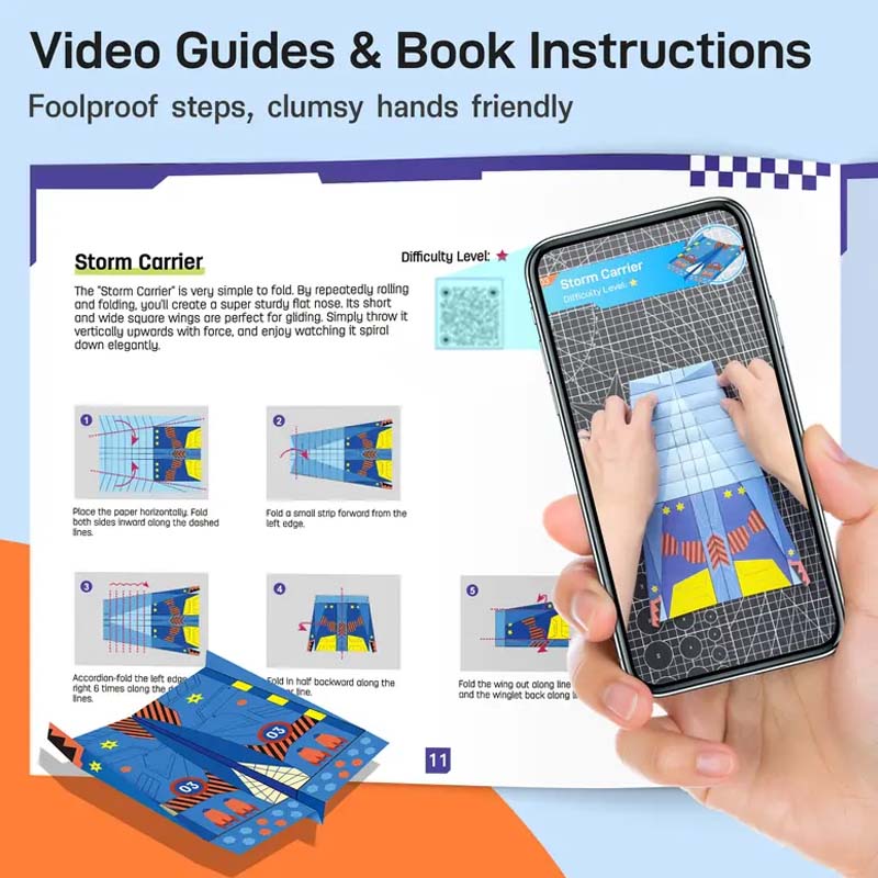 LÄTT OCH LÄTT ATT FALSA FÖR ALLA -Ingen erfarenhet av origami? Det är inget problem! Våra förkryssade viklinjer fungerar som stödhjul för pappersflygplan och guidar små händer till perfekta veck varje gång. Alla kan vara med på det roliga, från nybörjare till proffs, och bygga upp självförtroendet med varje vikning.