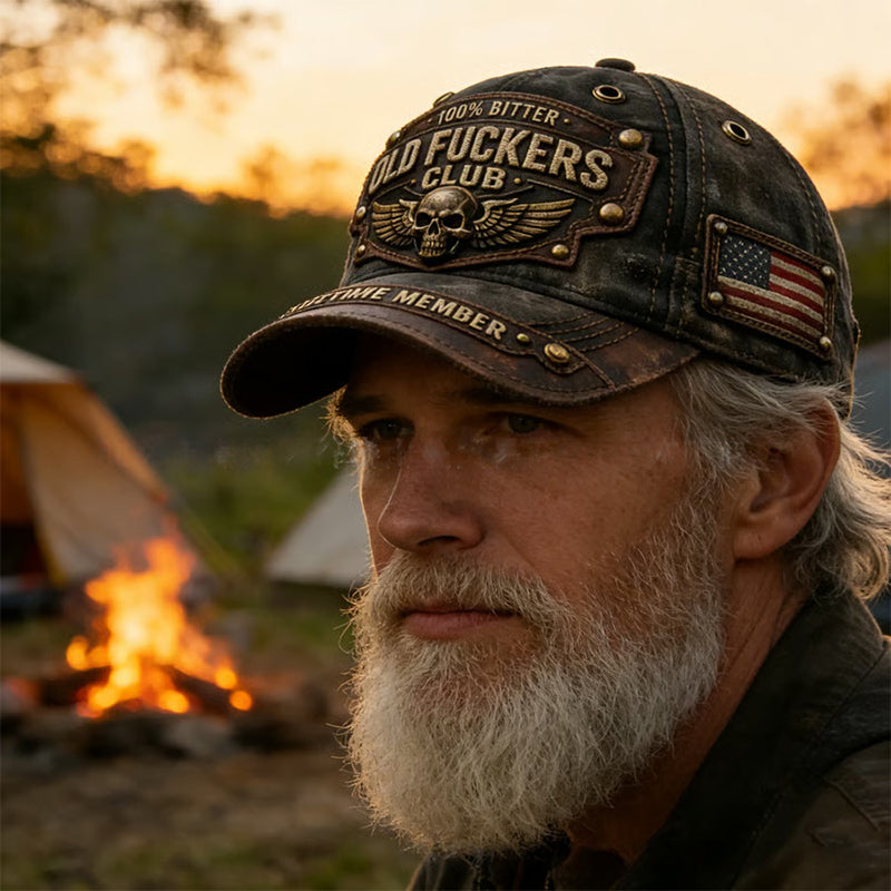DÅDLIG VINTAGE-BRODERI - Visa upp din erfarenhet med patchar med texterna ”OLD FUCKERS CLUB”, ”100% BITTER” och ”LIFETIME MEMBER”. Denna keps är en hedersbeteckning som hyllar ett väl levt liv med en kompromisslös, robust stil.