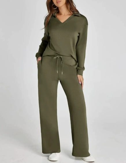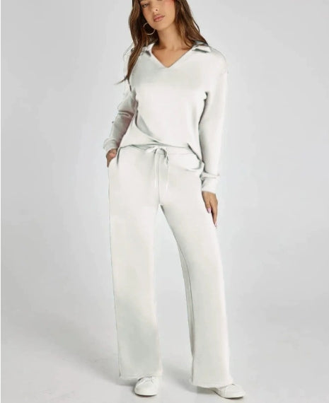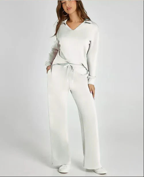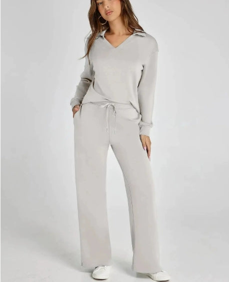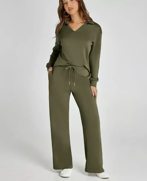 TrÀningsset Àr designat med en sportig polokrage, V-ringning och hög-lÄg fÄll. Byxorna Àr högmidjade med dragsko för en anpassad passform och har en lös silhuett som framhÀver vida ben. Den hög-lÄga fÄllen ger extra tÀckning bak, och tyget har fyrvÀgsstretch för enkel rörelse.